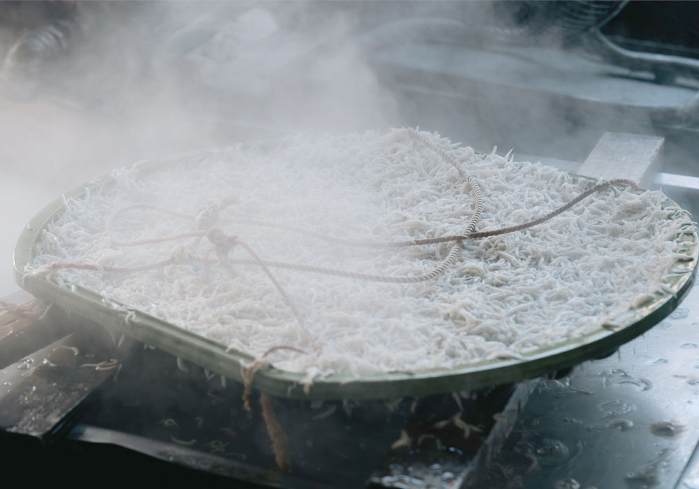 釜揚げ後は、しらすの状態を見ながら仕上げ、 安心して召し上がっていただけるよう確認工程を重ねています。